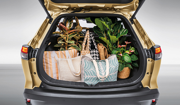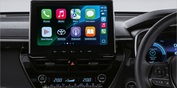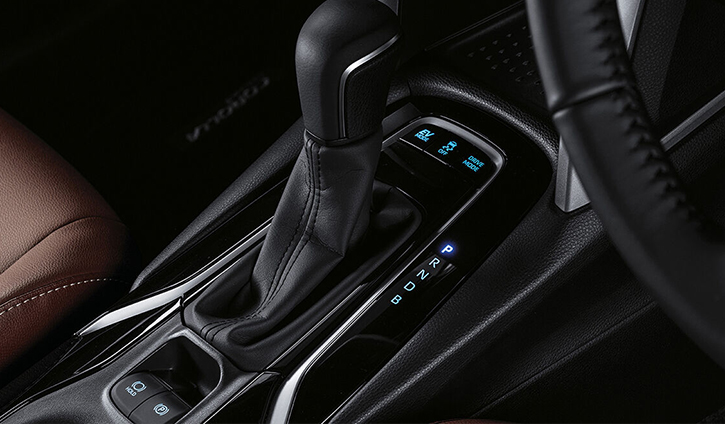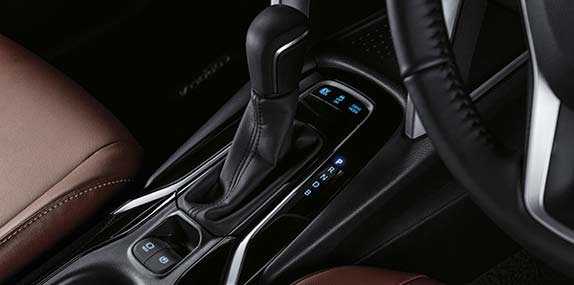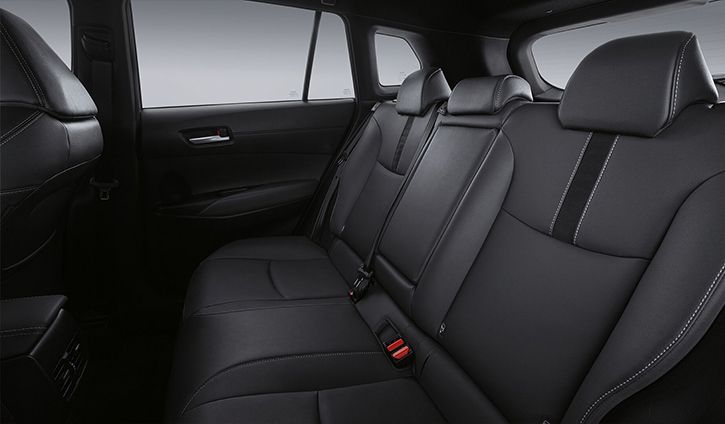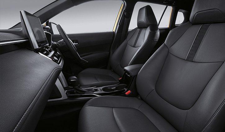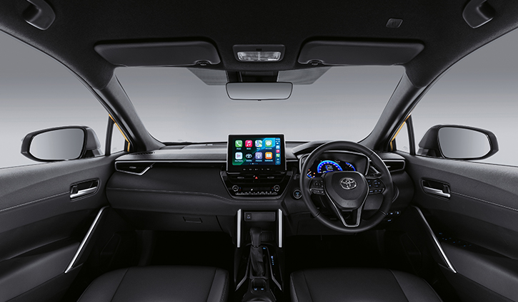 The Toyota Corolla Cross Hybrid offers a comfortable and well-equipped interior. It features seating for five with a 60:40 split for the second-row seats, allowing for flexible cargo and passenger configurations. The seats are trimmed in leather, with a leather-wrapped steering wheel and shift lever. Interior conveniences include power windows, automatic air conditioning, a digital clock, and multiple cupholders. The infotainment system comes standard with Android Auto and Apple CarPlay, accessible through a 4.2-inch color TFT multi-information display, and is connected to 6 speakers.