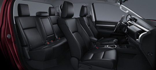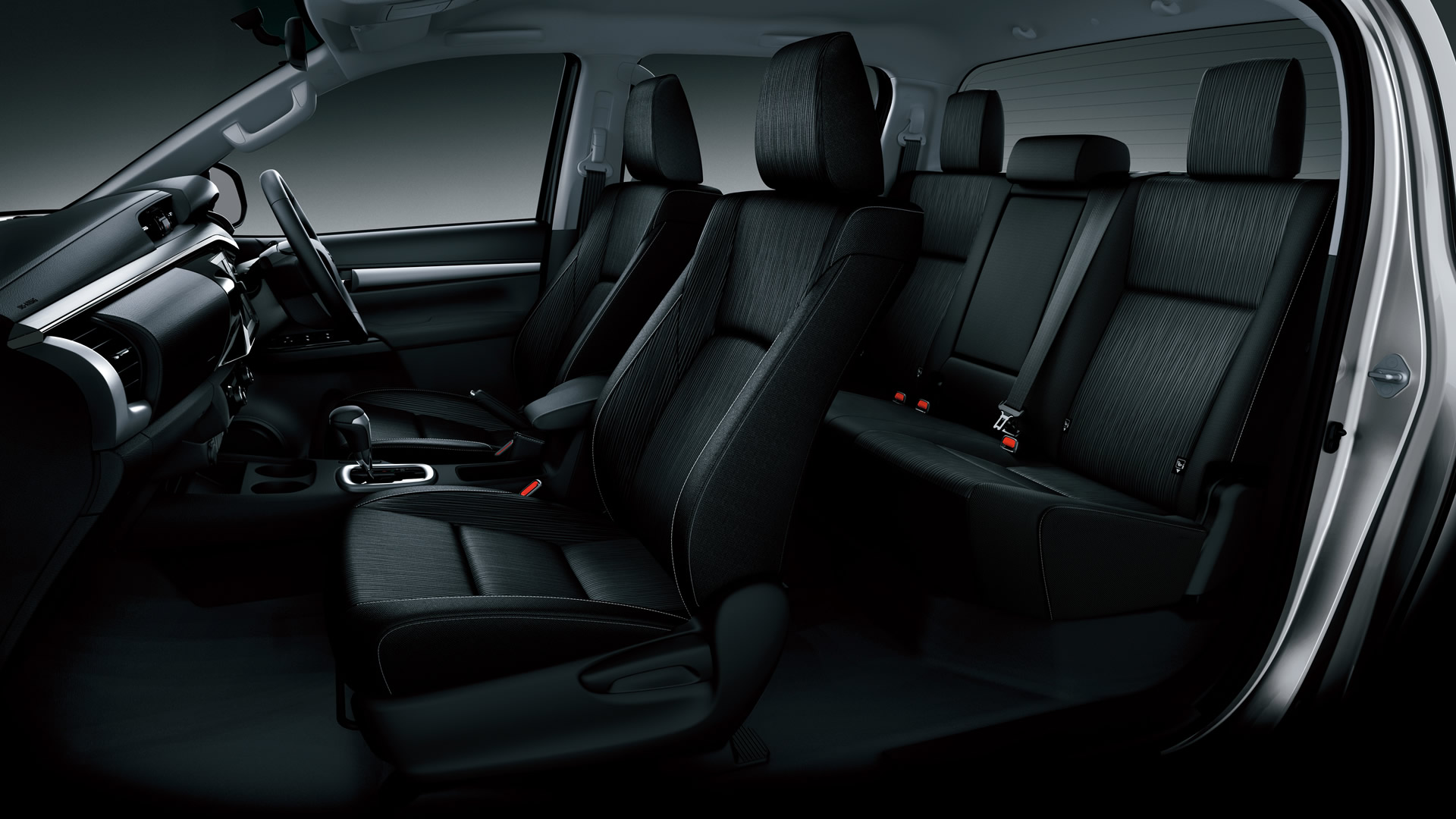 The Toyota Hilux Double Cab offers a 5-seat layout with fabric or leather-trimmed seats (depending on trim), featuring adjustable rear headrests and 60/40 split-folding rear seats (on higher trims) for cargo versatility. Standard amenities include manual air conditioning, four power windows with one-touch driver-side control, and a multi-information display (color TFT on select variants). Storage is optimized with cup holders, seatback pockets, and a lockable glove box. Higher trims add leather steering wheels, touchscreen audio with reverse camera, Android Auto/Apple CarPlay, and six speakers, balancing utility with modern connectivity. The cabin prioritizes durability with rugged floor carpeting and assist grips, while top models include auto climate control and illuminated entry for enhanced comfort.
