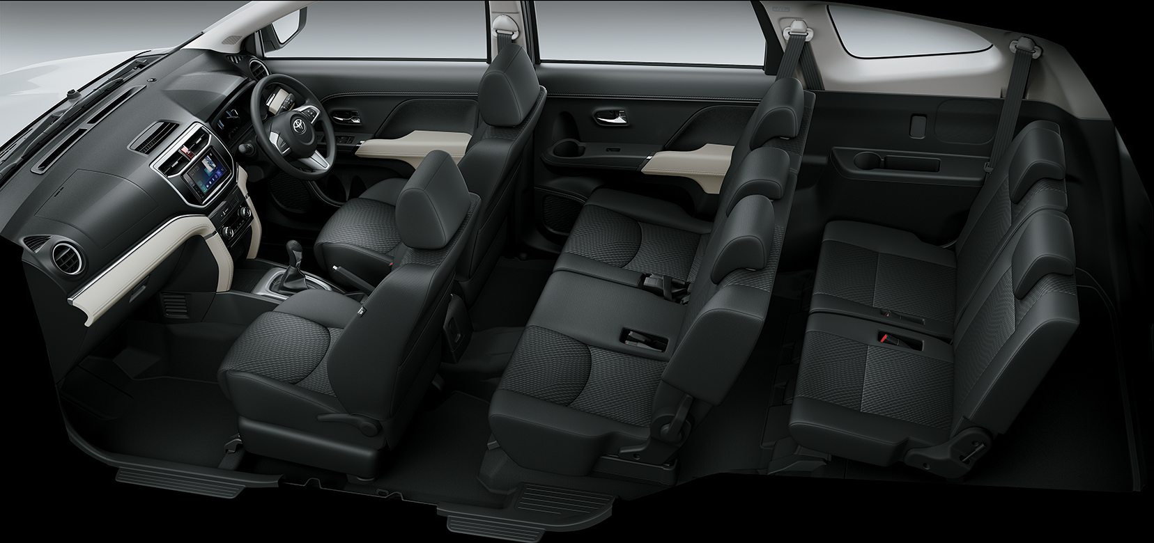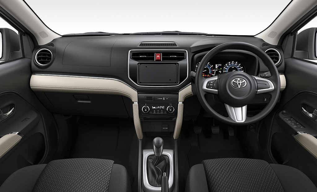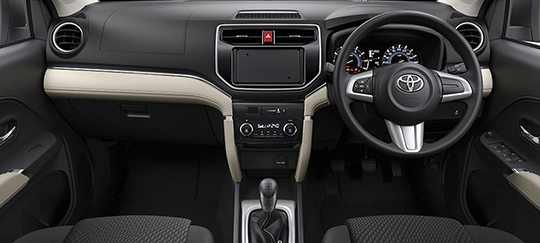 The Toyota Rush offers a practical interior designed for comfort and functionality, featuring a 7-seat layout with split-folding second-row seats for versatile cargo space. Standard amenities include fabric upholstery, a multi-information display, and dual-zone automatic climate control. Convenience is enhanced by Bluetooth connectivity, USB ports, and steering wheel audio controls. Safety-focused elements like height-adjustable seatbelts and ISOFIX anchors complement its family-friendly design, while the reverse camera aids maneuverability. The cabin prioritizes user-friendly storage with a center console box and seatback pockets.
